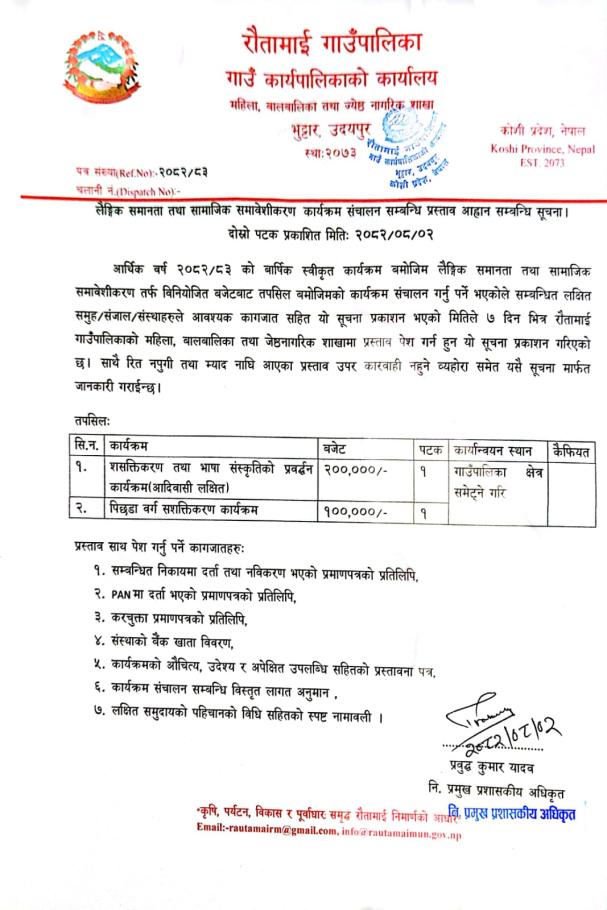लैङ्गिक समानता तथा सामाजिक समावेशीकरण कार्यक्रम सञ्चालन सम्बन्धी सूचना!!!