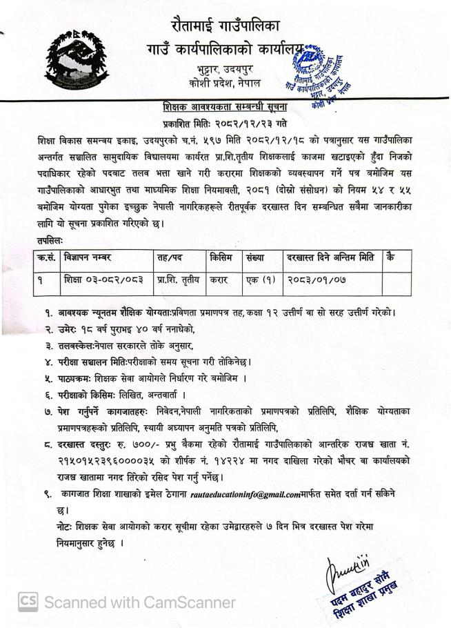 शिक्षक आवश्यकता सम्बन्धि सूचना!!!